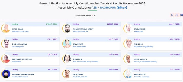 Updated:11:06 राघोपुर से RJD के तेजस्वी यादव 916 वोटों से आगे चल रहे है. वहीं उनके बड़े भाई तेज प्रताप यादव महुआ से खड़े हुए थे जो की 10776 वोटों से पीछे चल रहे है.