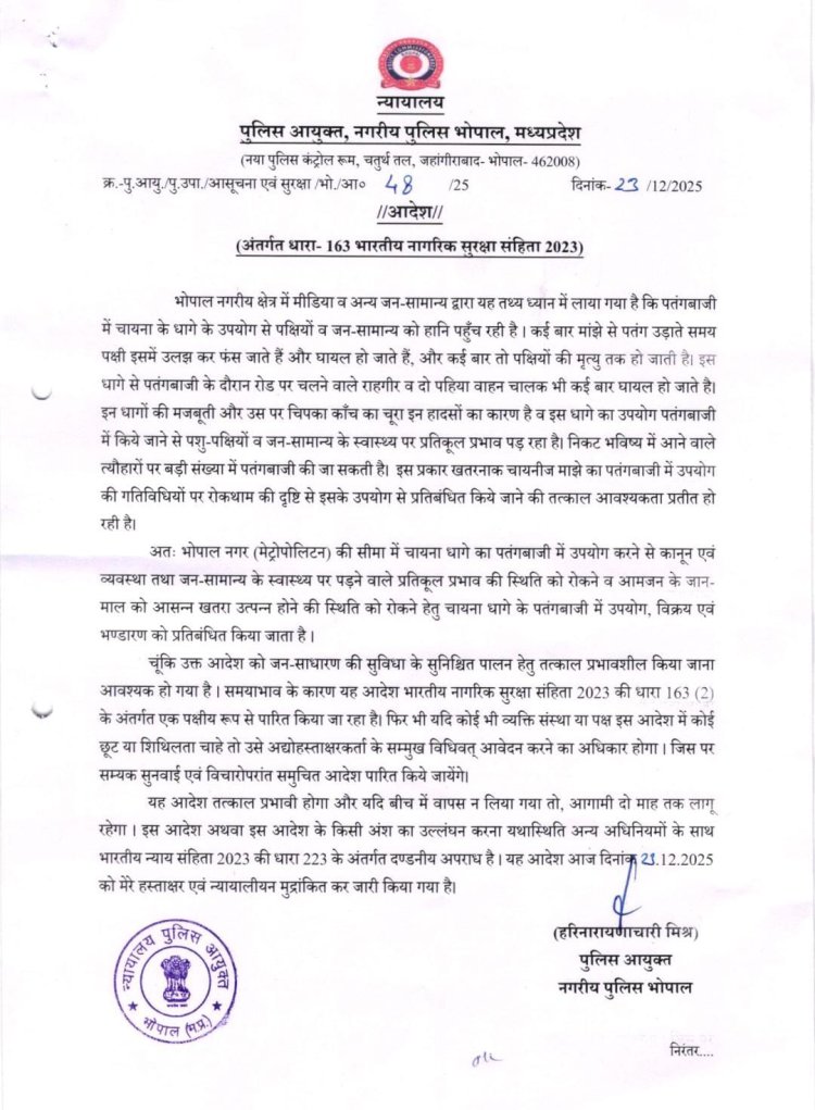 पुलिस कमिश्नर हरिनारायण चारी मिश्र द्वारा जारी आदेश के अनुसार यह निर्णय भारतीय नागरिक सुरक्षा संहिता 2023 की धारा 163(2) के तहत तत्काल प्रभाव से लागू किया गया है। आदेश के मुताबिक भोपाल शहर की सीमा में पतंगबाजी के दौरान चाइनीज़ मांझे का उपयोग, उसका विक्रय और भंडारण पूरी तरह प्रतिबंधित रहेगा और चाइनीज़ मांझे के साथ पकड़े जाने पर संबंधित व्यक्ति के खिलाफ कड़ी कानूनी कार्रवाई की जाएगी।