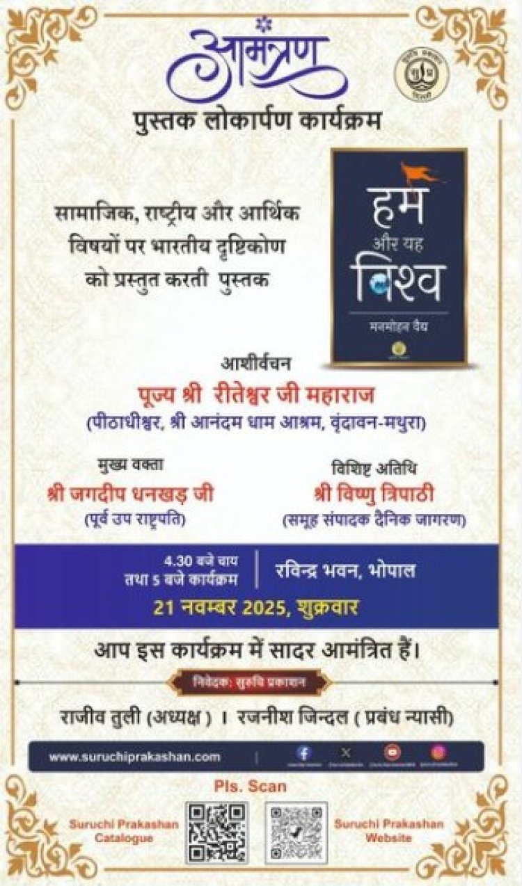 पूर्व उपराष्ट्रपति जगदीप धनखड़ 21 नवंबर को भोपाल आएंगे। पद छोड़ने के बाद धनखड़ का यह पहला सार्वजनिक कार्यक्रम होगा। जिसमें वे संबोधन देंगे। भोपाल के रवीन्द्र भवन में 21 नवंबर को राष्ट्रीय स्वयंसेवक संघ के सह सरकार्यवाह मनमोहन वैद्य की किताब "हम और यह विश्व" का विमोचन होगा। इस कार्यक्रम में मुख्य वक्ता के रूप में पूर्व उप राष्ट्रपति जगदीप धनखड़ संबोधन देंगे। कार्यक्रम में वृंदावन के श्री आनंदम धाम आश्रम के पीठाधीश्वर रीतेश्वर जी महाराज और वरिष्ठ पत्रकार विष्णु त्रिपाठी विशिष्ट अतिथि के रूप में शामिल होंगे