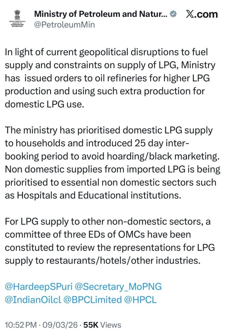 भारत के पेट्रोलियम और प्राकृतिक गैस मंत्रालय ने 9 मार्च 2026 को निर्देश जारी करते हुए कहा—
