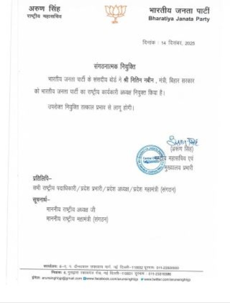 नई दिल्ली: बीजेपी ने अपने नए राष्ट्रीय कार्यकारी अध्यक्ष की घोषणा कर दी है। बीजेपी के अगले राष्ट्रीय कार्यकारी अध्यक्ष बिहार सरकार में मंत्री नितिन नबीन होंगे। बीजेपी के राष्ट्रीय महासचिव अरुण सिंह ने एक प्रेस रिलीज जारी कर बताया कि पार्टी ने नितिन नबीन को नया राष्ट्रीय कार्यकारी अध्यक्ष नियुक्त किया है।