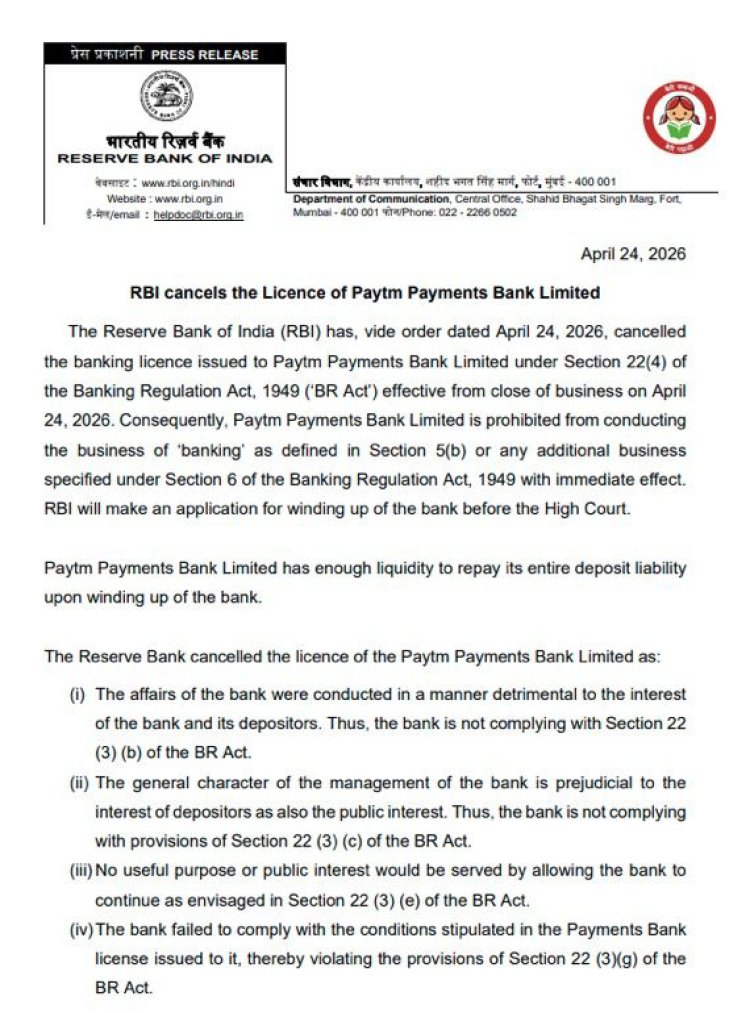 भारतीय रिज़र्व बैंक (RBI) ने Paytm Payments Bank को लेकर बड़ा फैसला लिया है। केंद्रीय बैंक ने 24 अप्रैल से Paytm Payments Bank का बैंकिंग लाइसेंस रद्द कर दिया है और इसके साथ ही बैंक की कई प्रमुख सेवाओं पर रोक लगा दी गई है। RBI के इस कदम को वित्तीय क्षेत्र में एक महत्वपूर्ण कार्रवाई माना जा रहा है, जिसका असर ग्राहकों और कंपनी दोनों पर पड़ सकता है।