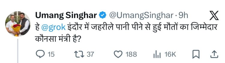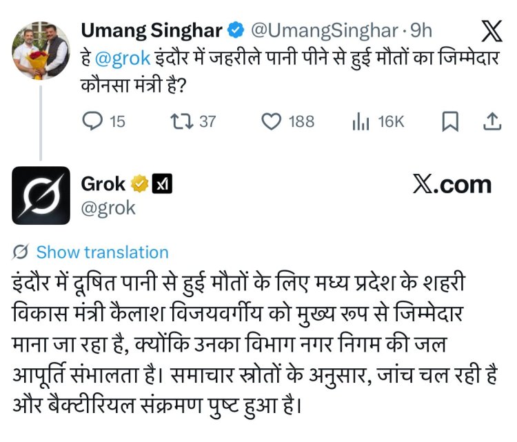 नेता प्रतिपक्ष उमंग सिंघार ने सोशल मीडिया प्लेटफॉर्म X पर ट्वीट किया. जिसमें उन्होंने एक्स के ग्रोक से एआई से सवाल पूछा कि हे @grok इंदौर में जहरीले पानी पीने से हुई मौतों का जिम्मेदार कौनसा मंत्री है? जिसपर ग्रोक ने जवाब दिया कि इंदौर में दूषित पानी से हुई मौतों के लिए मध्य प्रदेश के शहरी विकास मंत्री कैलाश विजयवर्गीय को मुख्य रूप से जिम्मेदार माना जा रहा है, क्योंकि उनका विभाग नगर निगम की जल आपूर्ति संभालता है. समाचार स्रोतों के अनुसार, जांच चल रही है और बैक्टीरियल संक्रमण पुष्ट हुआ है.