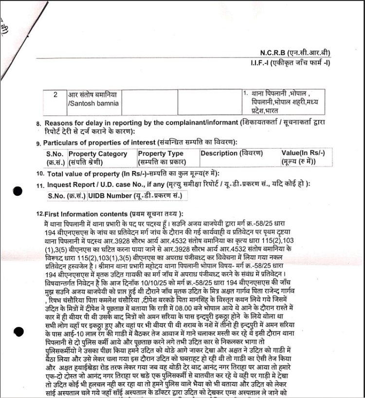 भोपाल में पिपलानी थाना क्षेत्र के इंद्रपुरी इलाके में पुलिस ने एक युवक को इतनी बेरहमी से पीटा कि उसकी मौत हो गई। मृतक युवक का नाम उदित राज था, जो बालाघाट में हॉक फोर्स में पदस्थ डिप्टी सुपरिंटेंडेंट ऑफ पुलिस (DSP) का साला बताया जा रहा हैं। इस घटना का CCTV वीडियो सोशल मीडिया पर वायरल हो गया हैं। पूरी खबर पढ़ें..
