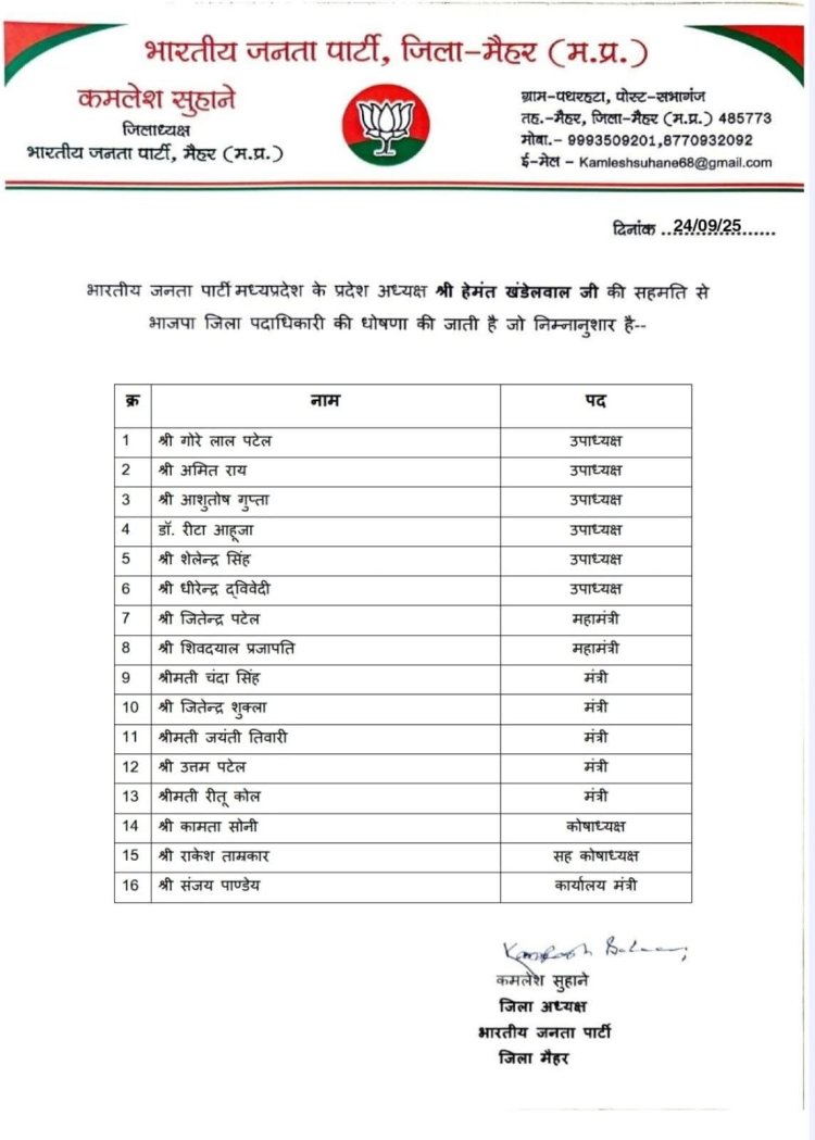 मध्यप्रदेश बीजेपी के अध्यक्ष हेमंत खण्डेलवाल की सहमति से मैहर जिले के जिला पदाधिकारियों की घोषणा की गई है.