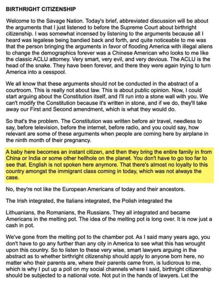 U.S. President Donald Trump ने एक पोस्ट शेयर की, जिसने अंतरराष्ट्रीय स्तर पर नई बहस छेड़ दी है। इस पोस्ट में चिट्ठी कट्टरपंथी अमेरिकी लेखक और रेडियो होस्ट Michael Savage की एक चिट्ठी और वीडियो के अंश शामिल हैं, जिसमें जन्म के आधार पर नागरिकता (Birthright Citizenship) की आलोचना की गई है। साथ ही India और China जैसे देशों पर विवादित टिप्पणी की गई है। इस में चिट्ठी भारत और चीन को Hell hole (नरक का द्वार) बताया गया है।