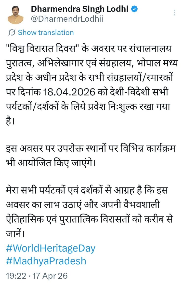 18 अप्रैल, शनिवार को विश्व विरासत दिवस के अवसर पर सभी संग्रहालयों और स्मारकों में पर्यटकों/दर्शकों के लिए प्रवेश निःशुल्क रहेगा। राज्य के सभी संग्रहालयों और स्मारकों में फ्री एंट्री रहेगी, जिससे लोग बिना टिकट के घूम पाएंगे।