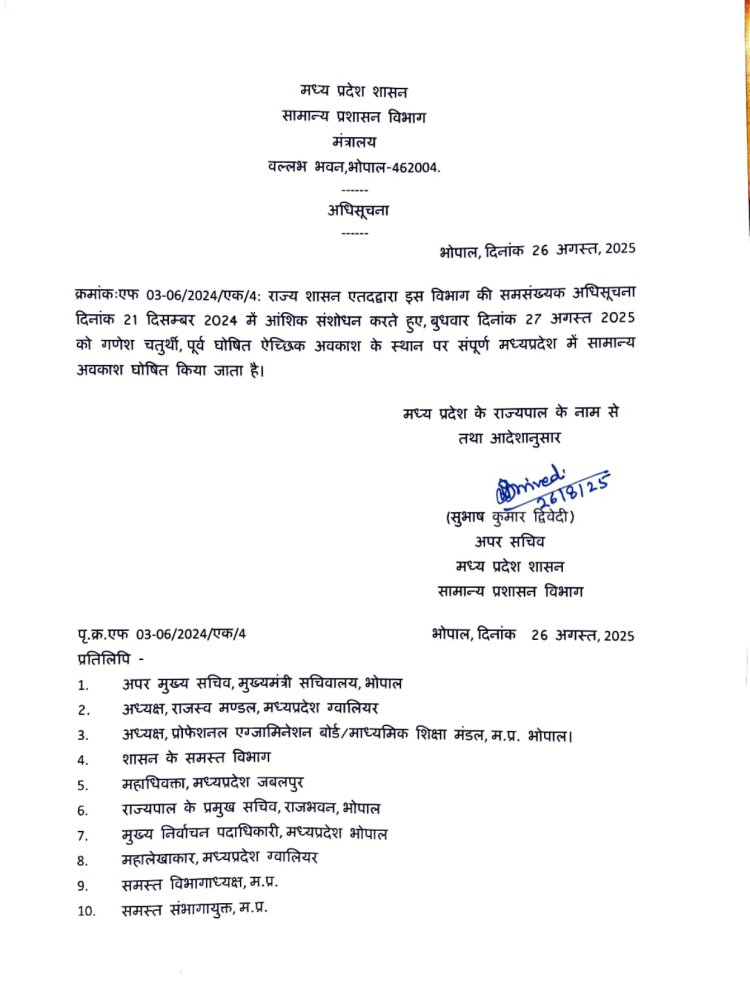 राज्य शासन द्वारा आदेश जारी किया गया है कि कल यानि 27 अगस्त को गणेश चतुर्थी के चलते पूरे प्रदेश में छुट्टी रहेगी.