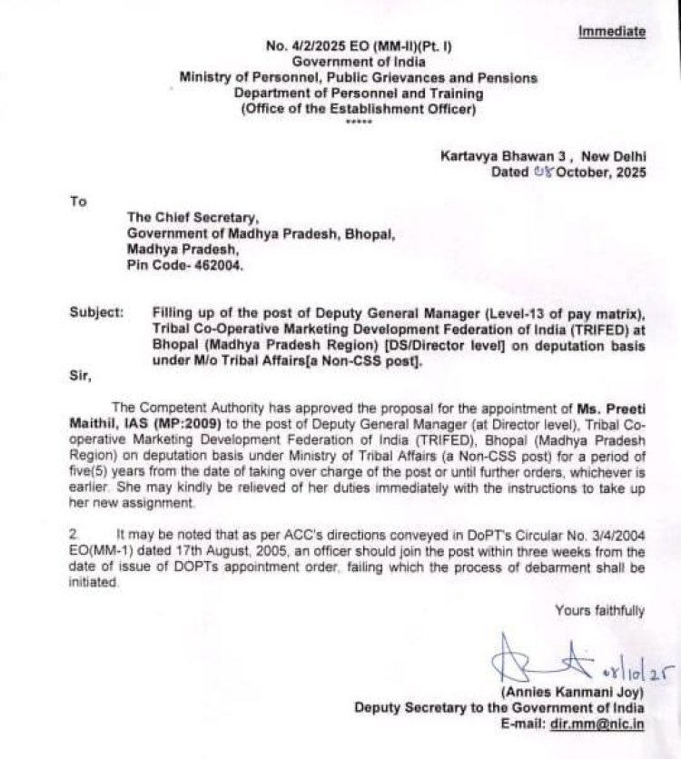 IAS प्रीति मैथिल को केंद्र सरकार ने TRIFED के MP रीजन की DGM नियुक्त किया
