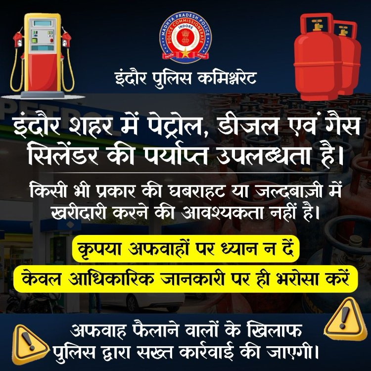 प्रशासन ने एक बार फिर नागरिकों से अपील की है कि वे किसी भी तरह की अफवाहों पर विश्वास न करें और केवल आधिकारिक जानकारी पर ही भरोसा करें। साथ ही यह भी कहा गया है कि शहर में ईंधन की कोई कमी नहीं है और आपूर्ति पूरी तरह सामान्य है। इंदौर पुलिस ने भी साफ संदेश दिया है कि अफवाह फैलाने वालों पर कड़ी नजर रखी जा रही है और ऐसे लोगों के खिलाफ सख्त कानूनी कार्रवाई की जाएगी। प्रशासन का कहना है कि सोशल मीडिया पर फैलने वाली गलत सूचनाओं से बचना ही सबसे जरूरी है, ताकि किसी भी तरह की अनावश्यक स्थिति या दहशत से बचा जा सके।