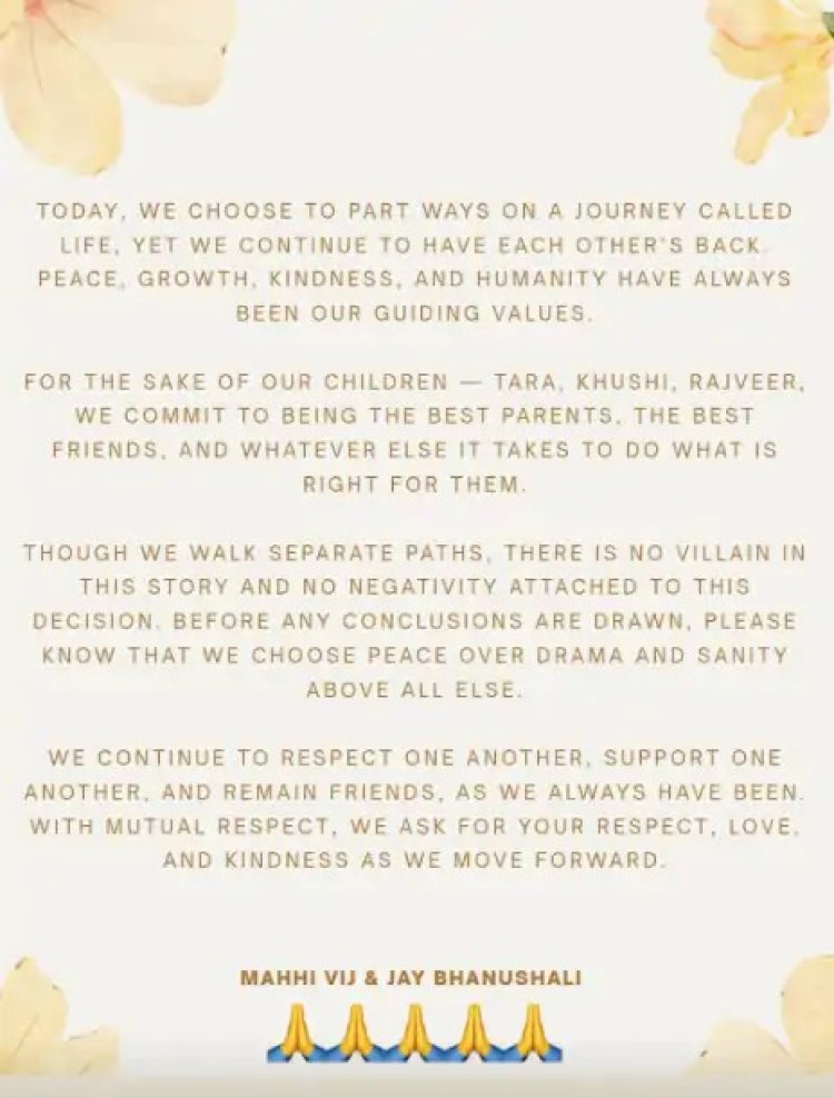 जय और माही ने अपने बच्चों तारा, खुशी और राजवीर का भी जिक्र किया। उन्होंने कहा कि बच्चों के लिए वे हमेशा अच्छे मां-बाप और दोस्त बने रहेंगे और उनके फ्यूचर के लिए सही फैसले लेने की पूरी कोशिश करेंगे।