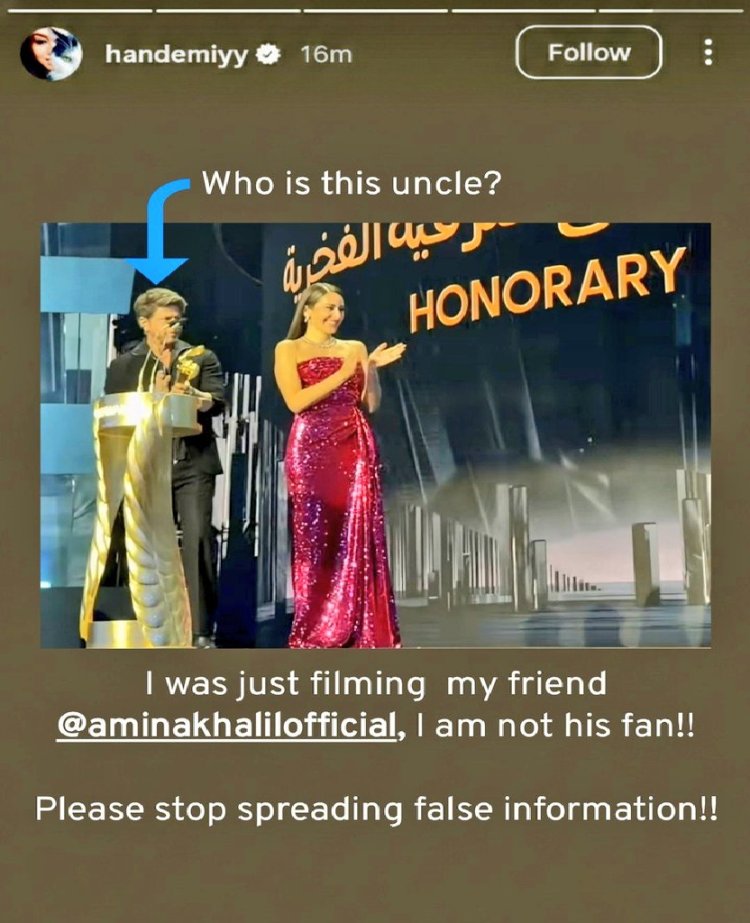 हालांकि अब हांडे एरचेल ने इन अफवाहों पर सफाई दी है। उन्होंने इंस्टाग्राम स्टोरी पर एक पोस्ट शेयर कर बताया कि वो शाहरुख खान को नहीं, बल्कि अपनी दोस्त और मिस्र की एक्ट्रेस अमीना खलील को रिकॉर्ड कर रही थीं। वीडियो में शाहरुख खान और अमीना खलील दोनों स्टेज पर मौजूद थे।