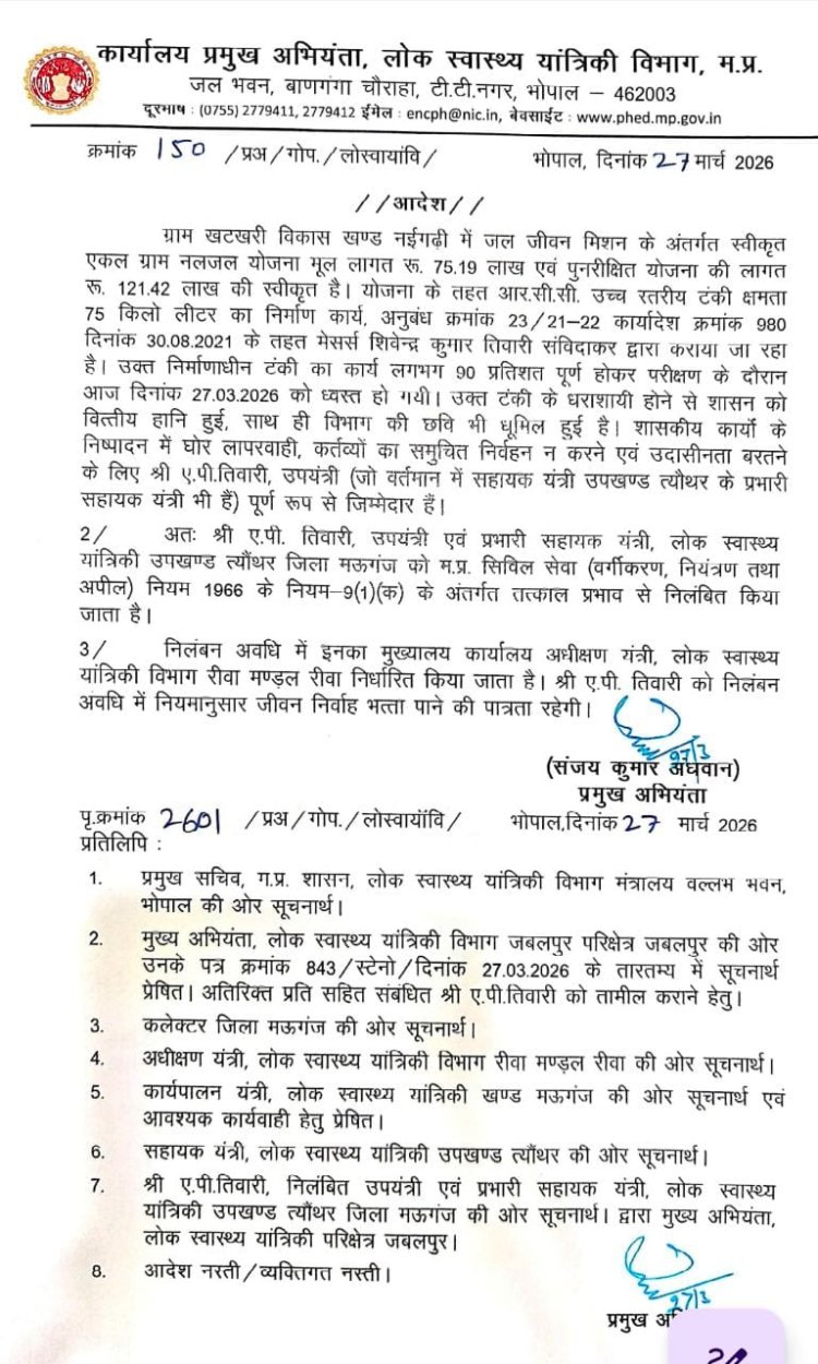 पब्लिक वाणी खबर का असर: मऊगंज में टंकी ढहने के मामले में बड़ी विभागीय कार्रवाई