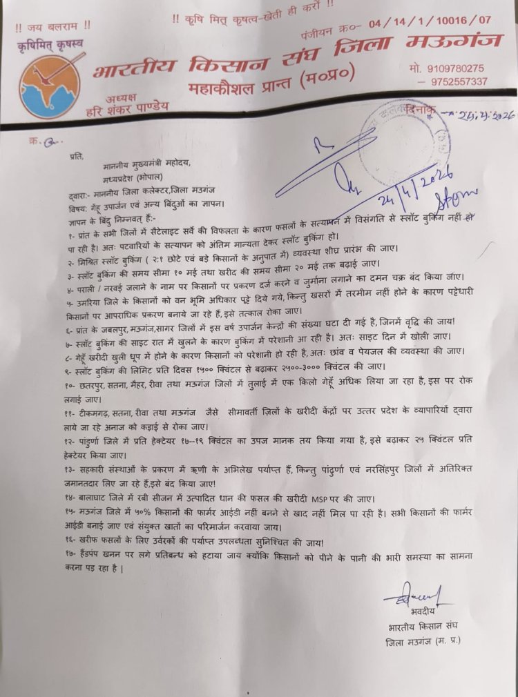 मऊगंज से राजेंद्र पयासी की रिपोर्ट। भारतीय किसान संघ जिला मऊगंज ने गेहूं उपार्जन में अव्यवस्था सहित 17 सूत्रीय अन्य मांगों को लेकर मध्य प्रदेश शासन के नाम का कलेक्टर मऊगंज को ज्ञापन सौंपा। भारतीय किसान संघ मऊगंज के जिला अध्यक्ष हरिशंकर पांडेय के नेतृत्व और संभागीय अध्यक्ष सीएल द्विवेदी की विशेष उपस्थिति में 24 अप्रैल को सौंपे गए ज्ञापन के माध्यम से मांग की गई कि प्रांत के सभी जिलों में सैटेलाइट सर्वे की विफलता के कारण फसलों के सत्यापन में विसंगति से स्लॉट बुकिंग नहीं हो पा रही है।