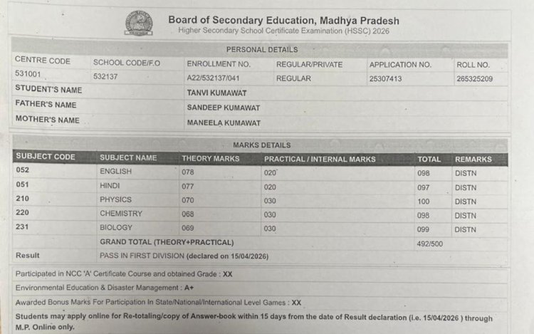 मध्य प्रदेश माध्यमिक शिक्षा मंडल के 10वीं और 12वीं के परीक्षा परिणाम घोषित। इंदौर की छात्रा तन्वी कुमावत ने शानदार प्रदर्शन करते हुए 12वीं साइंस में पूरे प्रदेश में टॉप किया।