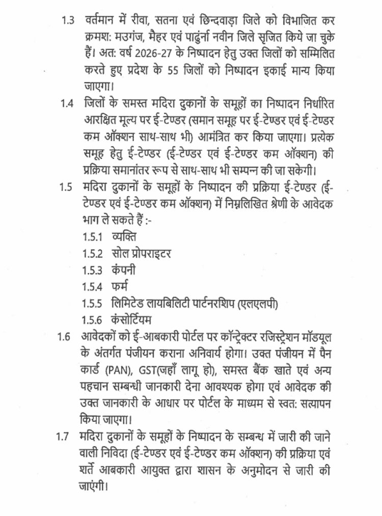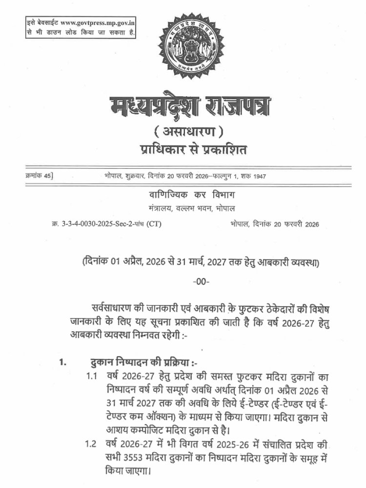 मध्य प्रदेश सरकार ने वर्ष 2026–27 के लिए नई आबकारी नीति (MP New Excise Policy) को मंजूरी दे दी है। राज्य सरकार ने स्पष्ट कर दिया है कि राज्य में कोई भी नई शराब दुकान नहीं खुलेगी और मौजूदा दुकानों का नवीनीकरण (रिन्यूअल) भी समाप्त कर दिया गया है। अब ई-टेंडर से आवंटन होगा।