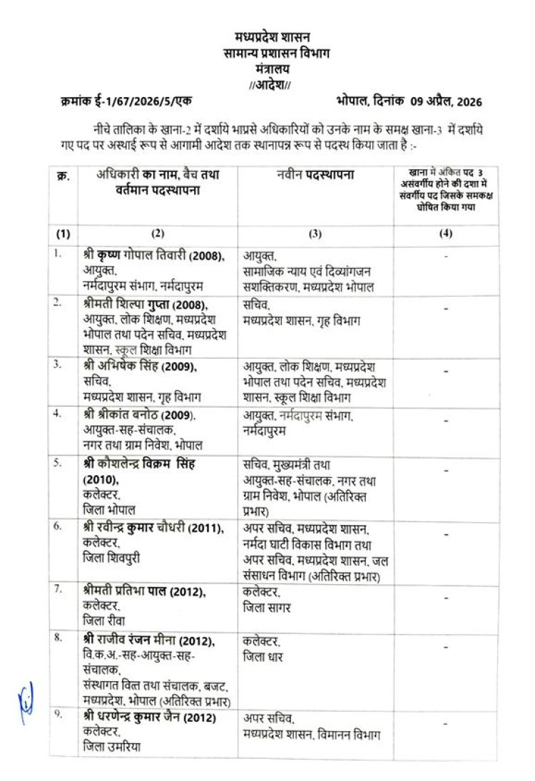 मध्य प्रदेश में 26 IAS अधिकारियों का तबादला हुआ है, जिसमें रीवा के कलेक्टर और नगर निगम आयुक्त भी बदले गए हैं।