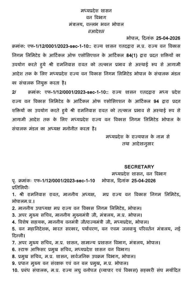 मध्य प्रदेश वन विभाग द्वारा इस संबंध में आदेश जारी कर दिया गया है. आदेश के मुताबिक, राज्य शासन ने कंपनी के आर्टिकल ऑफ एसोसिएशन के आर्टिकल 94 के तहत प्रदत्त शक्तियों का उपयोग करते हुए रामनिवास रावत को तत्काल प्रभाव से, आगामी आदेश तक, मध्य प्रदेश राज्य वन विकास निगम लिमिटेड भोपाल के संचालक मंडल का अध्यक्ष मनोनीत किया है.