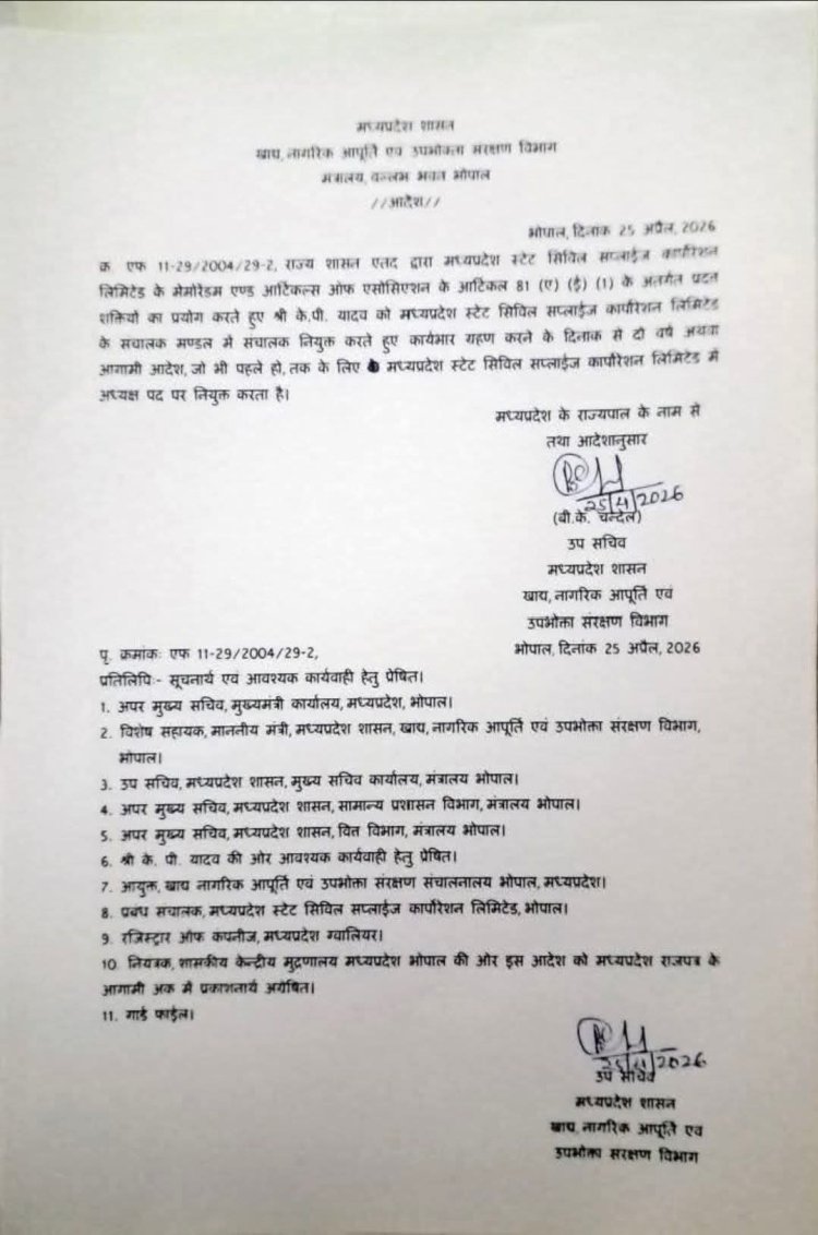 प्रदेश में हाल ही में कई अन्य निगम-मंडलों में भी नियुक्तियां की गई हैं. इससे पहले केपी यादव को मध्य प्रदेश सिविल सप्लाई कॉर्पोरेशन का अध्यक्ष बनाया गया था, जिनका कार्यकाल 2 साल का रहेगा.