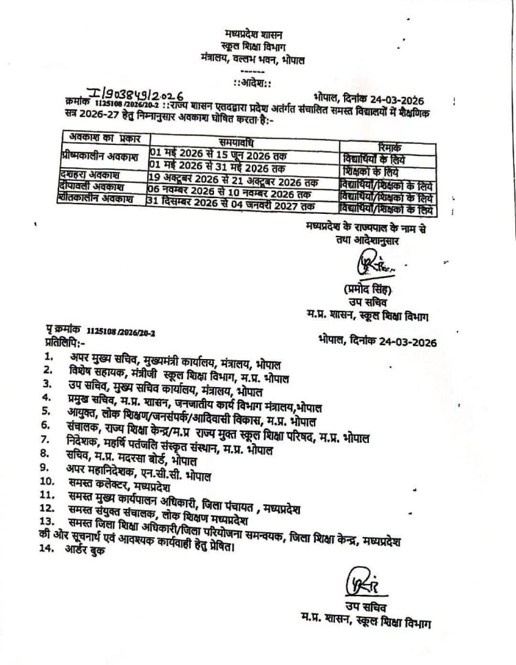 वहीं शीतकालीन अवकाश 31 दिसंबर 2026 से 4 जनवरी 2027 तक रहेगा। यह आदेश 24 मार्च 2026 को भोपाल से जारी किया गया है और इसे राज्य के सभी शासकीय विद्यालयों में लागू किया जाएगा।