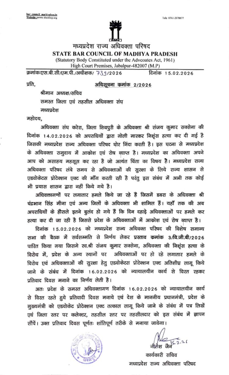 शिवपुरी जिले के करैरा में अधिवक्ता संजय कुमार सक्सेना की 14 फरवरी 2026 को अपराधियों ने दिनदहाड़े गोली मारकर हत्या कर दी गई. इस घटना से प्रदेश के अधिवक्ता समुदाय में भारी आक्रोश और रोष व्याप्त है.