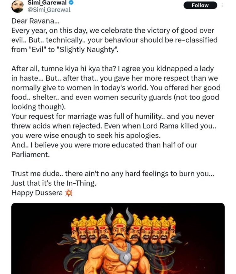 दशहरा पर रावण के समर्थन में बोलीं सिमी गरेवाल, हुईं ट्रोल