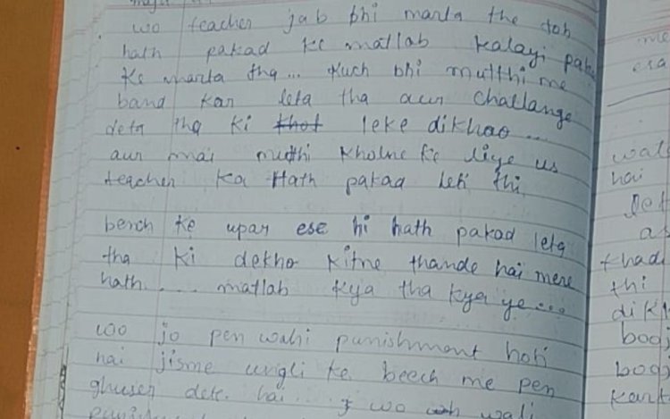 उसका कहना था कि टीचर जब भी मारता था तो उसका हाथ पकड़ लेता था और अजीब तरह की हरकतें करता था। कभी पेन को उंगलियों के बीच दबाकर सजा देता था, तो कभी हाथ पकड़कर बोलता था—देखो कितना ठंडा है मेरा हाथ।