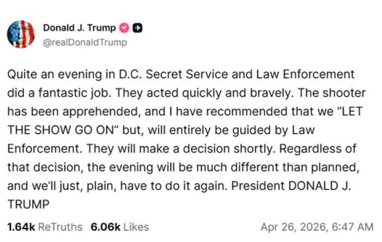 घटना के करीब डेढ़ घंटे बाद राष्ट्रपति Donald Trump ने मीडिया को संबोधित किया। उन्होंने इस हमले को “अमेरिका के संविधान पर हमला” बताया और सुरक्षा एजेंसियों की सराहना की। ट्रम्प ने कहा कि सुरक्षाकर्मियों ने बहादुरी से काम किया, जिससे बड़ा नुकसान टल गया। उन्होंने यह भी बताया कि एक अधिकारी को गोली लगी थी, लेकिन बुलेटप्रूफ जैकेट पहनने के कारण वह सुरक्षित है।